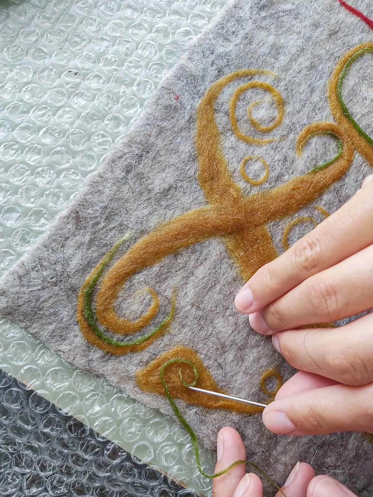 A dutch noun meaning, a small, often meaningless task that requires labor-intensive, time-consuming, and constant work. I found inspiration in the book of Kells, an illuminated manuscript from around 800 AD. The book contains the four Gospels of the New Testament and is made up of 340 leaves of vellum, each containing extremely elaborate paintwork. The miniatures and initials were painted with rich colors by scribes. These artworks are specifically famous for their combination of detail and bigger compositions. I wanted to draw attention to the richly decorated and fragile pages by making my own pages out of felt. By laying out every strand of wool with a needle and loosely rolling the hair into the felt, I could relate just a little bit, to the insane amount of time these scribes must have been painting, hunched over their books, all to produce a single letter.